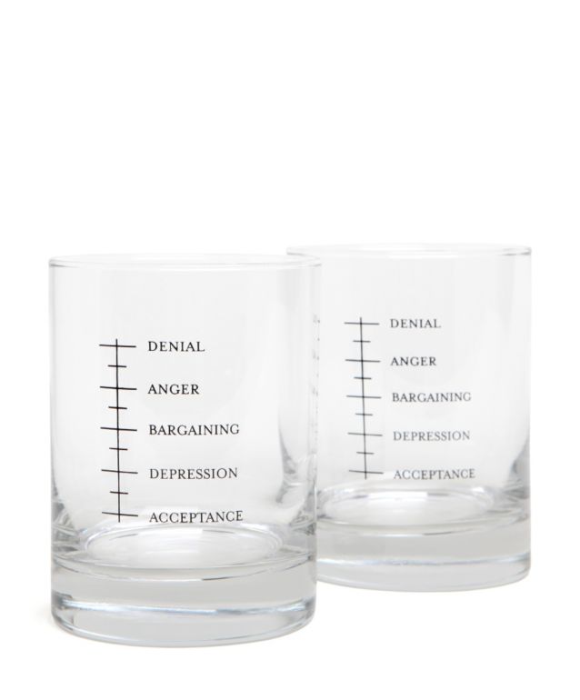 The Good Grief Drinking Glasses let you pour the correct amount of liquor for the corresponding amount of depression and anger. They give you two so you can have an epic movie moment and throw one against a wall in a fit of anger.